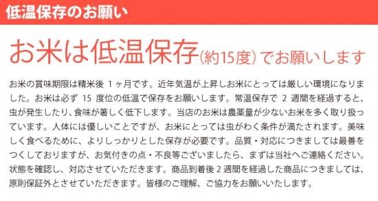 お米は低温保存(15度)でお願いします。お米の賞味期限は精米後1ヶ月です。近年気温が上昇しお米にとっては厳しい環境になりました。お米は必ず15度位の低温で保存をお願いします。常温保存で2週間を経過すると、虫が発生したり、食味が著しく低下します。美味しく食べるために、よりしっかりとした保存が必要です。品質・対応につきましては最善をつくしておりますが、お気付きの点・不良等ございましたら、レビューの前にまずは当社へご連絡ください。状態を確認し、対応させていただきます。商品到着後2週間を経過した商品につきましては、原則保証外とさせていただきます。皆様のご理解、ご協力をお願いいたします。